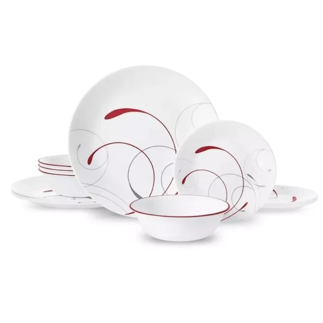 Introducing our Elegant Splendor 12-Piece Dinnerware Set, a perfect blend of classic style and modern functionality. Designed to add a touch of elegance to your daily meals and special occasions, this set is adorned with delicate plumes of soft gray and rich red. Its sleek shapes bring a timeless beauty to your dining table, making every meal a splendid experience.