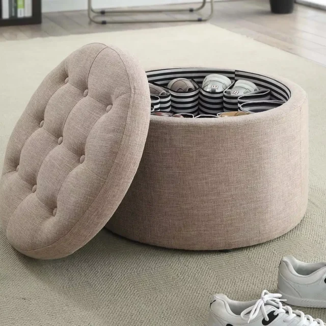 Step into a world where functionality meets fashion with our Elegant Tan Fabric Round Ottoman. This versatile piece not only provides a chic solution to shoe storage but also enhances your home decor. Its unique design allows it to blend seamlessly into any room, offering both a stylish accent and a practical storage solution.