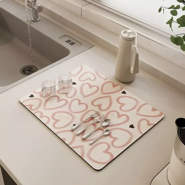 Experience a multitude of benefits with our Heart-Print Diatom Mud Dish Drying Mat. It’s not just a mat, it’s a game-changer for your kitchen routine: