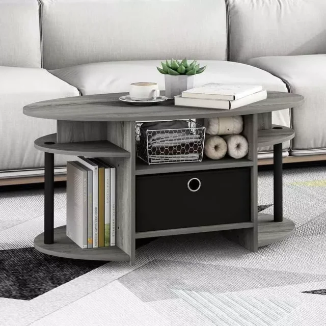 What sets this coffee table apart is its commitment to sustainability without compromising on style. The use of recycled materials in its construction not only makes it an eco-friendly choice but also ensures it’s robust and long-lasting. Additionally, its unique oval shape and integrated storage solutions make it a standout piece that combines elegance with practicality.