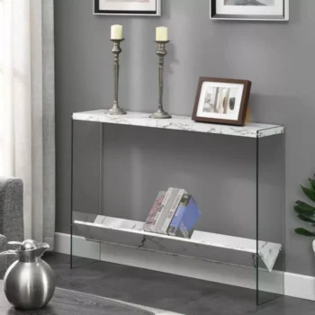 Elegant White Faux Marble & Glass Console Table with Shelf
