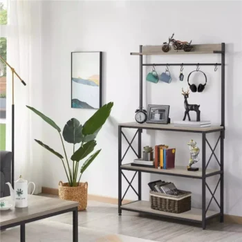 67″ Rustic Brown Wooden Kitchen Bakers Rack with Storage Shelves & Hooks