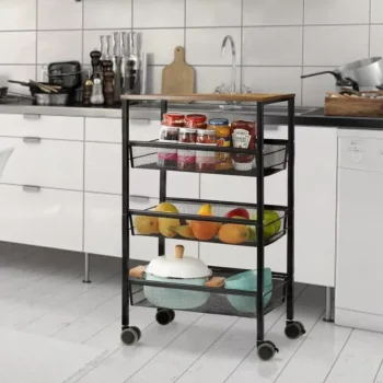 4-Tier Rolling Kitchen Storage Cart with Wooden Shelves & Lockable Wheels